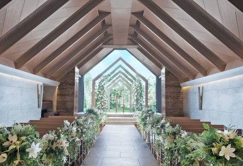 もうひとつのチャペル「セントアクアチャペル名駅」。木や緑、光の温かさに包まれた挙式に。100名収容。